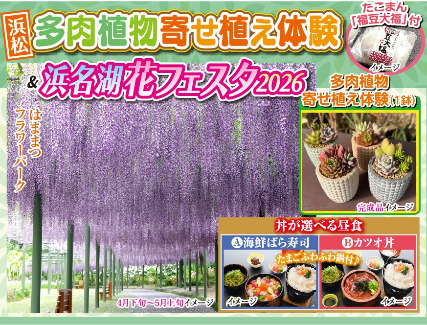 浜松で春を満喫! 「カクト・ロコ」で自分好みの多肉植物寄せ植え体験と、花フェスタ開催中のフラワーパークを散策。 昼食は選べる丼に袋井名物「たまごふわふわ鍋」付き! WEB予約ならポイント3倍でお得に春の彩りを楽しめます。