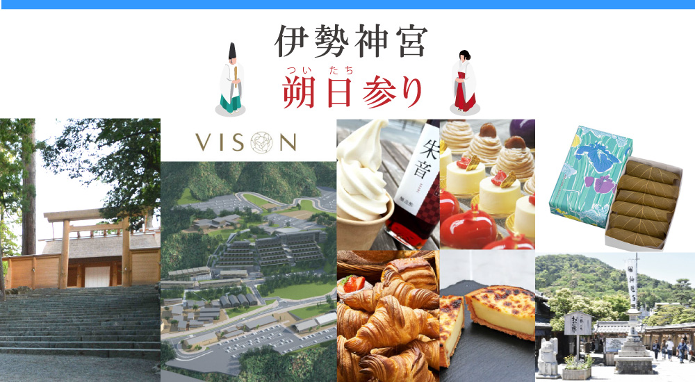感謝と祈りの「朔日参り」へ。 伊勢神宮・内宮を参拝し、活気あふれるおかげ横丁や話題のVISONで自由散策を。 5月は、子孫繁栄を願う縁起物「赤福の朔日餅(かしわ餅)」小箱付き! 月に一度の特別な日を、伊勢で心豊かに過ごしませんか?